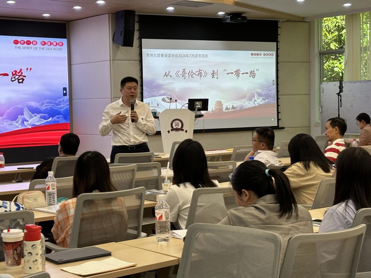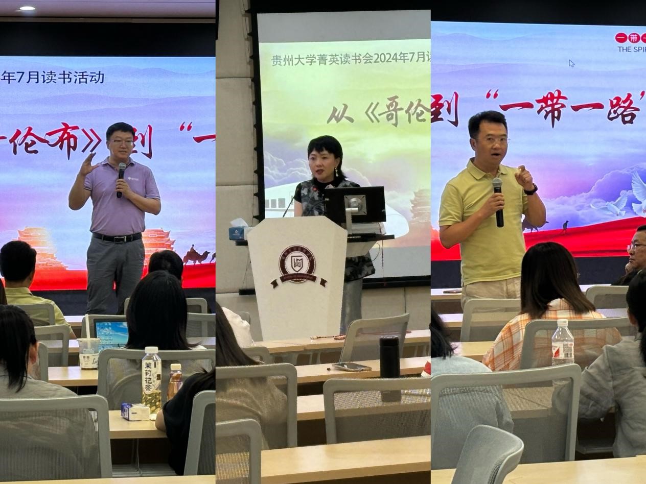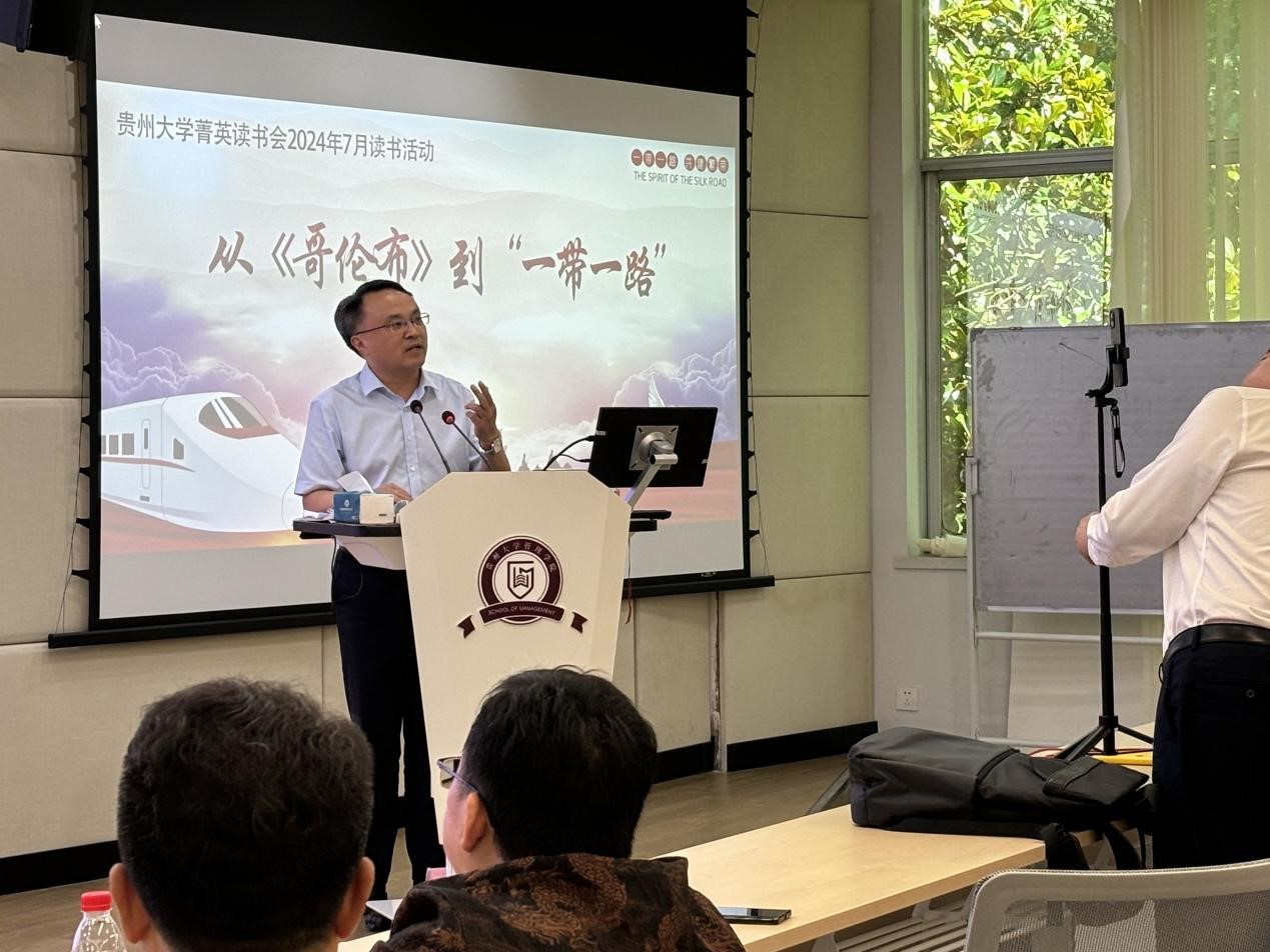 2024年7月6日,威尼斯登录入口welcome管理学(EMBA&MBA&EDP)菁英读书会在威尼斯登录入口welcome三楼报告厅举办了主题为从《哥伦布》到“一带一路”的读书活动。本期读书由EMBA校友罗纲举(贵阳方舟科技有限公司总经理、读书会荣誉会长)分享。活动以现场分享、互动提问的方式让来自读书会和学院在读的MBA约40多名校友、同学参与到本次活动当中。威尼斯登录入口welcome党委委员、威尼斯登录入口welcome院长李烨出席了活动。活动主持人为读书会会长吴迪、读书会联合会长陈隽宁。